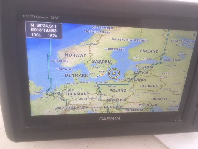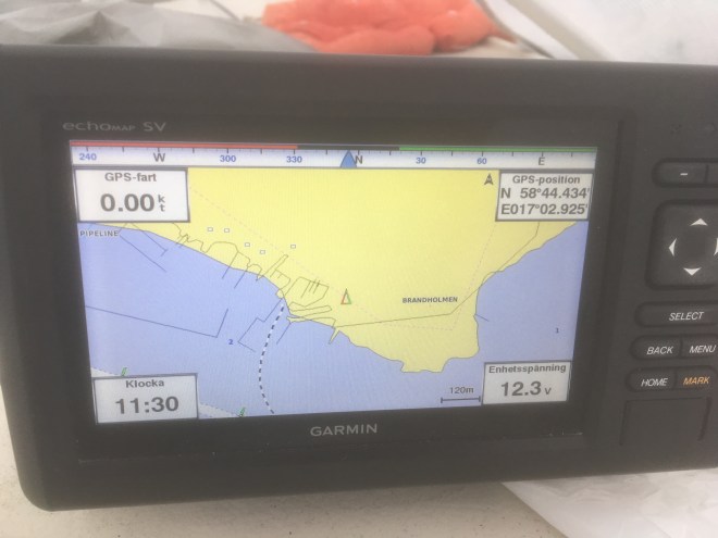 Gps:en jag använder är en Garmin echoMAP Chirp 72sv. Det är en modern gps, fast med knappar. Den inköptes för ett år sedan tillsammans med ett digitalt sjökort. Täckningsområdet är norra Europa – det blev inte dyrare än att köpa de olika delområdena över Sverige, Danmark och Finland.