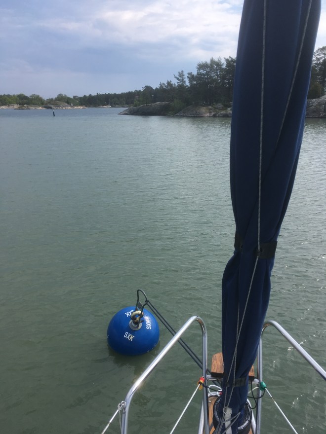 Vid Stendörren ligger jag nu helt ensam i den lugna lagunen på en SXK-boj.
