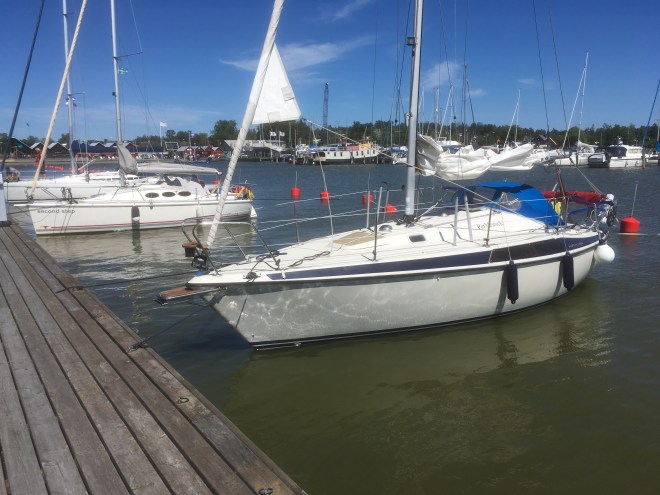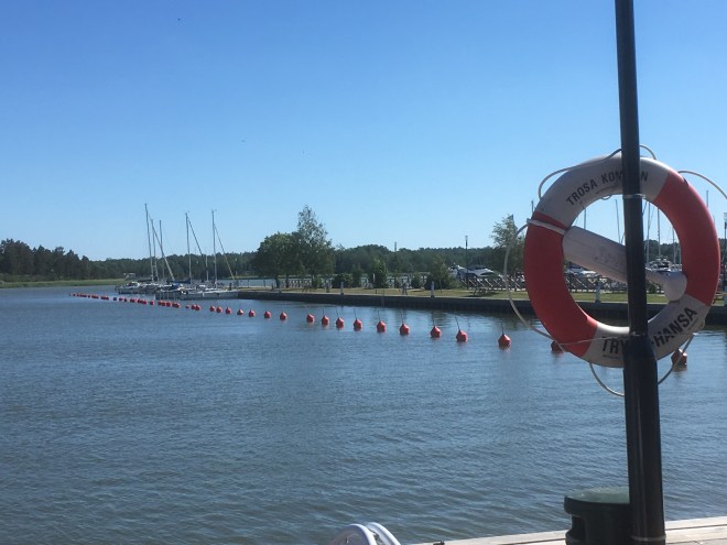 Det var en behaglig segling från Stendörren till Trosa. Vinden var västlig vilket innebar medvind. Vindstyrkan varierade mellan 5 och 8 m/s. Men lagom tills det var dags att börja kryssa sista biten in mot Trosa ökade vinden till mellan 8 och 11 m/s. Med fullt segelställ innebär det (för) kraftig krängning. Det visade sig snabbt vad vi inte packat på rätt sätt – dessa prylar hittade man på durken efteråt…