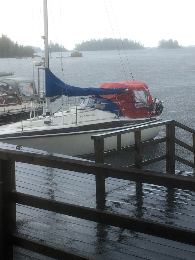 Vi hade lagom förtöjt och monterat upp akterkapell och segelkapell så kom regnet.
