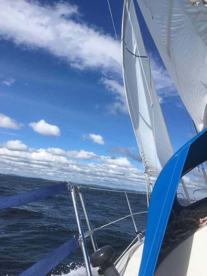 Väl ute vid mynningen mötte halvmeterhöga brytande vågor och en vind på 10 m/s. Segelsättningen var precis lagom och vi kunde kryssa i 4 – 5 knop.