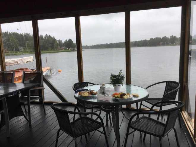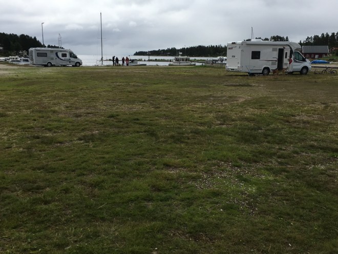 På den finska grannbåten var man ganska trött på den svenska ”sommaren”, men man visste att det varit lika risigt på finska sidan. Vi fick även bekräftat att den finska ”skärgården” mellan Vasa och Rauma inte är mycket att hurra över. Vårt beslut att åka på svenska sidan även på återvägen tyckte de var helt rätt. Alla låg kvar i hamnen pga den aviserade kulingen plus att tre båtar till kom in före kl 14. Vi var minst som vanligt.Mellanfjärden är en liten fin gästhamn med en restaurang som kan rekommenderas. Där åt vi dagens rätt som var en mkt god rödspätta. Det låg en ”riktig segelbåt” i hamnen. På andra sidan ån ligger ett fik som vi ska testa senare i dag. Där finns även ställplatser för husbilar. De har ett alldeles eget servicehus som tillråga på allt såg ut att vara typ 200 år nyare än vårt! Dessutom finns där korvkiosk men utan några specificerade öppettider😂