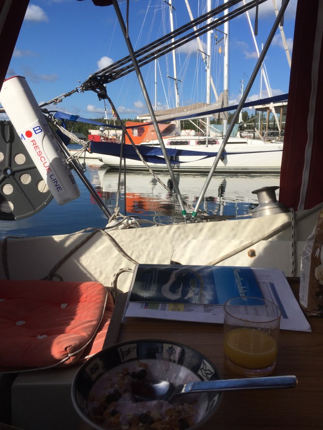 Här ligger vi nu tre båtar. En av dem låg intill oss i går i Mellanfjärden. De hade gjort tvärtom mot oss, börjat för motor och börjat segla andra halvan.
