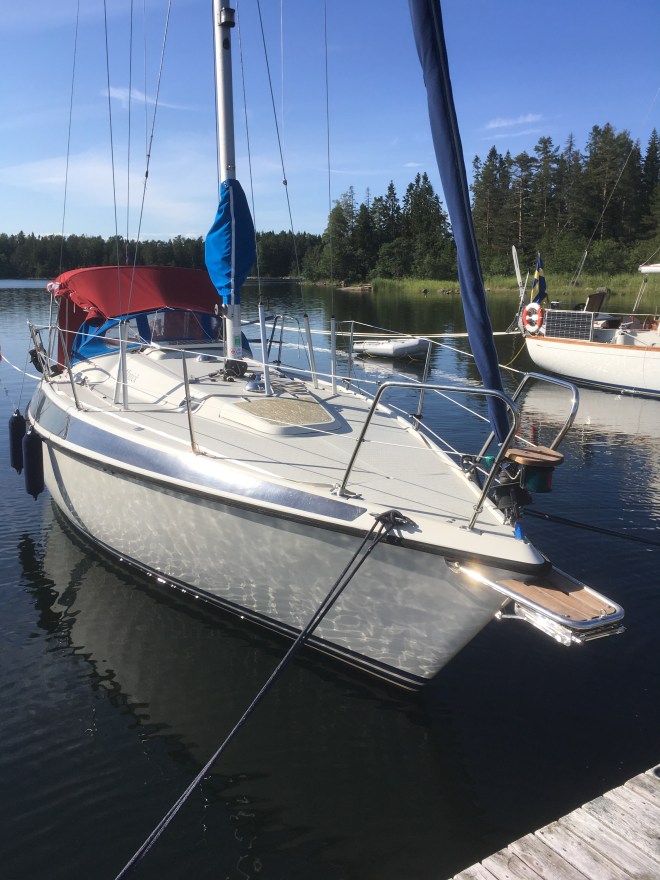 Vindprognosen från SMHI säger att vinden ska vrida mot syd från kl 11. Så istället för att kryssa i den svaga vinden ligger vi kvar några timmar och hoppas prognosen stämmer…