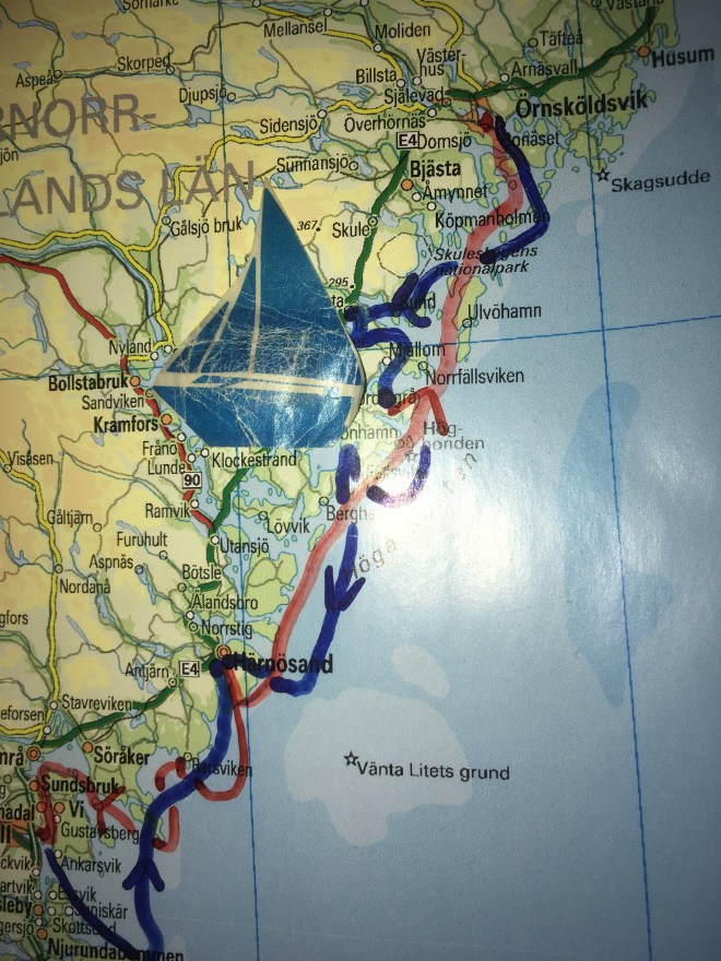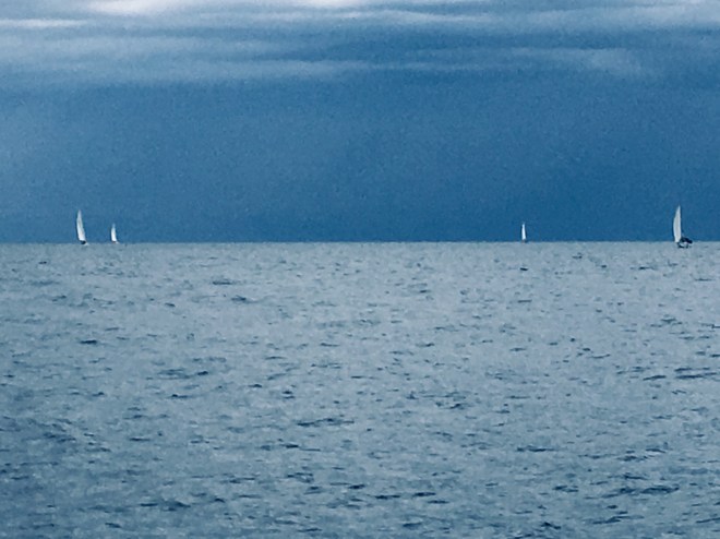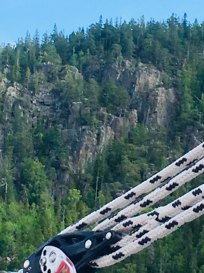 Väl ute ur viken kunde vi hissa segel och i vindar mellan 4 och 6 m/s hade vi halvvind. En häftig mörkblå vägg av moln passerade på behörigt avstånd.
