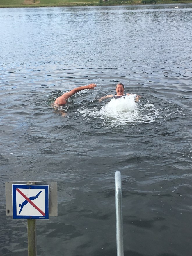 Före avsegling blev det bad. Fotografen dock kvar på bryggan. 18 grader i vattnet.