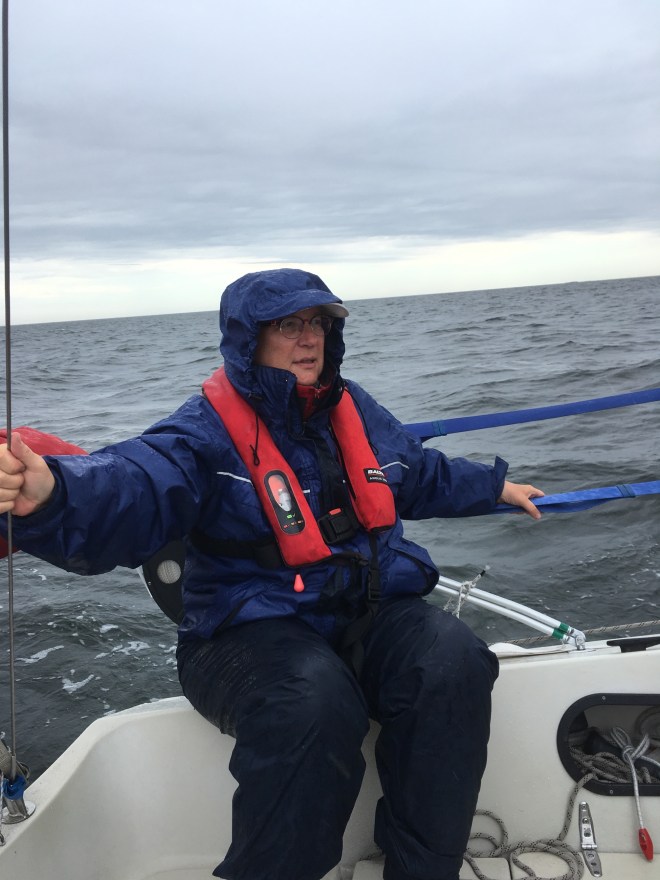 Dagens segling från Skatan till Stocka startade i sol och slutade i regn. Revet från gårdagen fick sitta kvar, men togs bort efter nån timme eftersom vinden avtog till 7-8 m/s. Däremot var det en jobbig dyning. Våghöjden rapporterades till 1,2 på en näraliggande station.