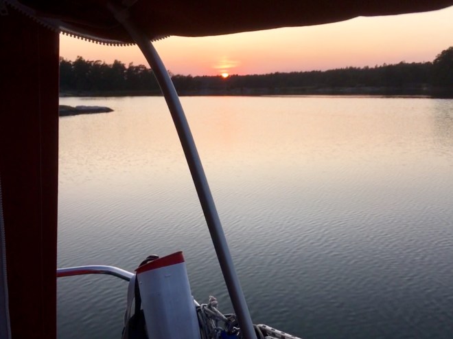 Vinden avtog (från 5 m-s) och kvällen blev fantastiskt fin. Vi firade sista kvällen på årets långsegling med ett dopp (19 grader).
