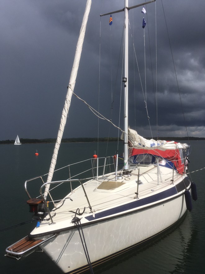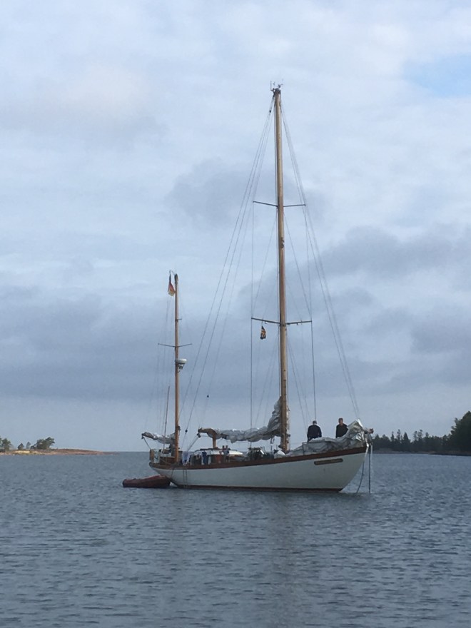Inför avfärd drog vi in ankarlinan så den gick nästan rakt ner, drog upp storen, drog upp ankaret ur blåleran och Monica kunde falla av och låta båten gå ut genom sundet. (För de som inte har båtförarbevis; Ja, det är alltså inte Monica som trillar av båten, utan båtens för [framdel] som ”faller undan för vinden”).