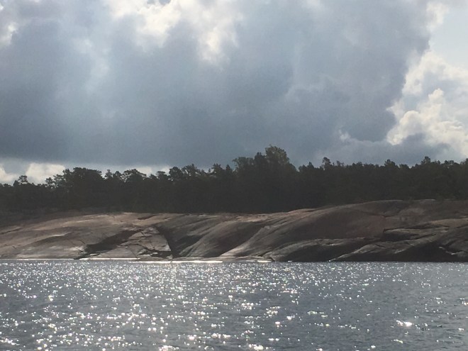 Det gick regnbyar både framför och bakom oss, men vi klarade oss ända till hamnen. Men bara nästan. Med 50 meter kvar kom en regnskur så vi blev härligt blöta.