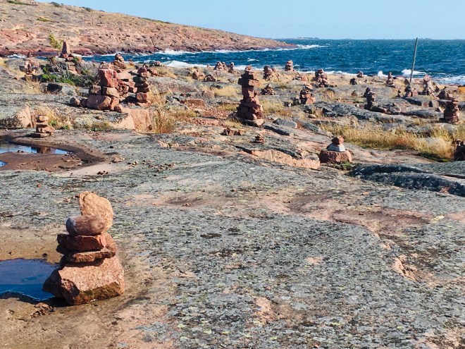 Fullt med små stenpyramider som byggts av besökare av okänd anledning.