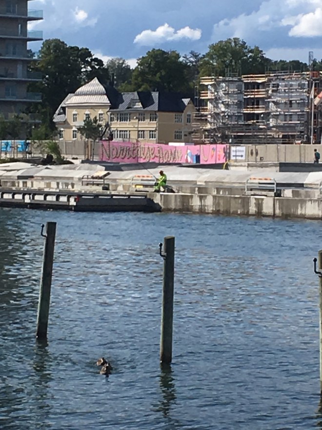 Mittemot gästhamnen pågår ett stort byggarbete. Det är fastigheter och planteringar på gång. Men mellan varven är det bäst att bara ta det lugnt och meta…