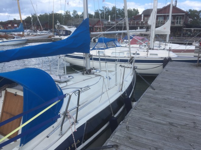 Vi fick en bekväm hamnplats utmed en brygga. Även hamnavgiften var ”bekväm”! Tack vare lågsäsong var det 50 % rabatt. Utan el-anslutning så blev prislappen 150 kronor – för hamnplats, toa, dusch, bastu och sopor.