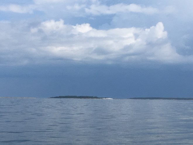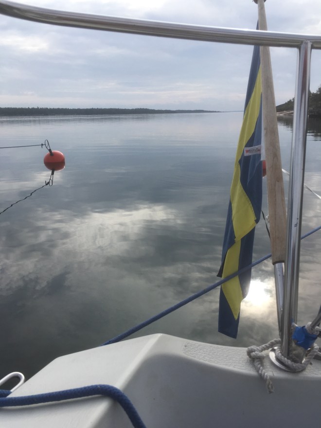 En kvart innan vi kom fram började det blåsa och samtidigt började det gå vågor. Så nu ligger vi här, mitt ute på havet, med en liten skärm av öar åt nordost. Men vind och vågor kommer från sydost, där nästa ö ligger i Åland!