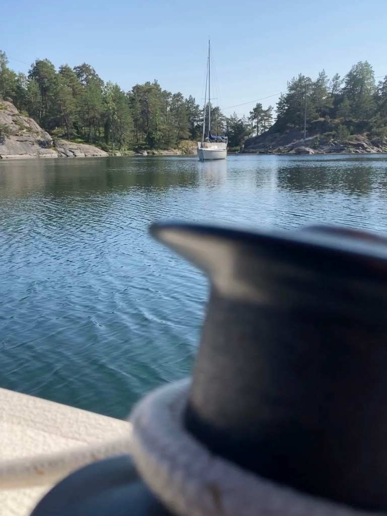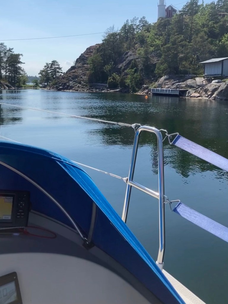 Vi har lagt oss på svaj i den lilla fina och säkra viken nedanför fyren.