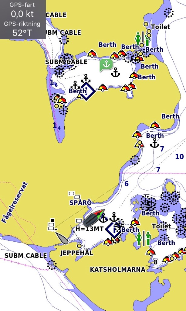 Vi fick ett par timmar i bra vind, när vi valde att segla bara med genuan. Vi loggade 3-4 knop i vindar mellan 3 och 5 m/s. När leden svängde blev det vind rakt ”på näbben” samtidigt som vinden avtog till ca 2 m/s. Så efter ett tag fick hjälpmotorn användas.