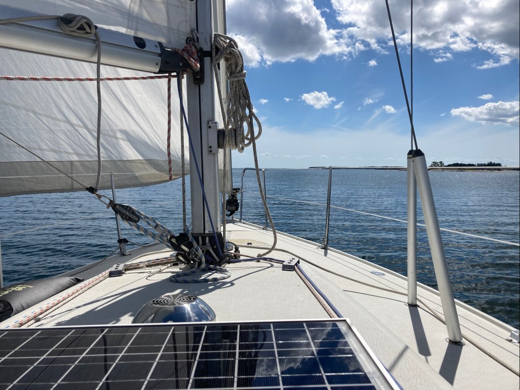 Seglingen hit från Blankaholm gick bra. Vi hade lätt medvind från NV. Strax efter 12 kom sjöbrisen farande från rakt motsatt håll med vindar uppåt 7 m/s. Vi tog motorn genom den trånga leden mellan Ekö och Engö. Ute vid Kråkelund satte vi revade segel. Vi passerade kärnkraftverket Simpevarp och dess kylvattenutsläpp. Trots att vi gick 0,6 km utanför den vik man släpper kylvattnet steg vattentemperaturen på 2 grader.