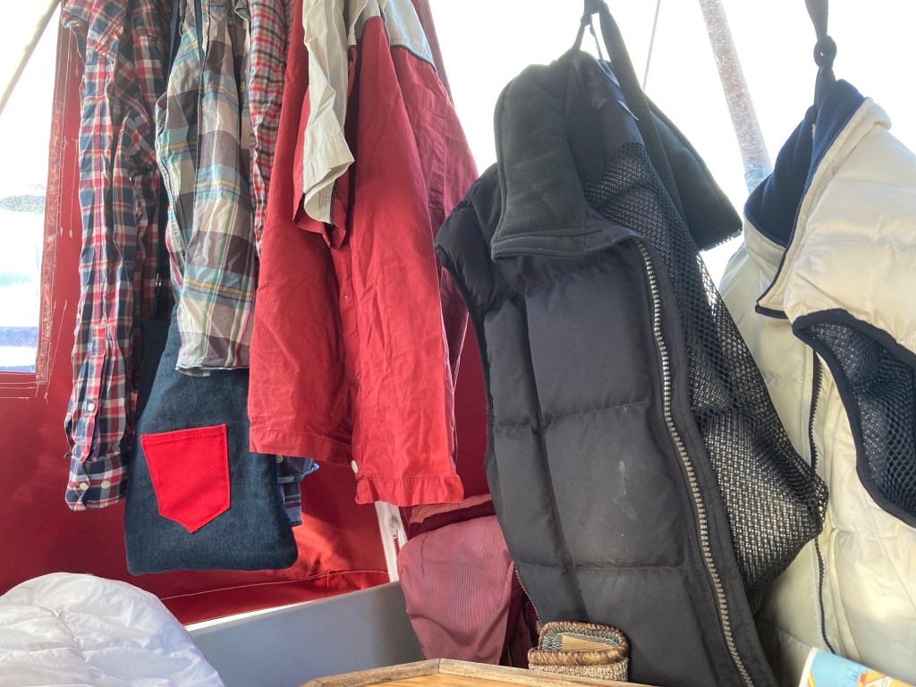 Så nu hänger allt på tork. Mantåg är bra som tvättlinor! Tur att det blåser och solen skiner. Förpiken är omvandlad till torkrum (bastu), genom att värmarens hela kapacitet kopplats dit.