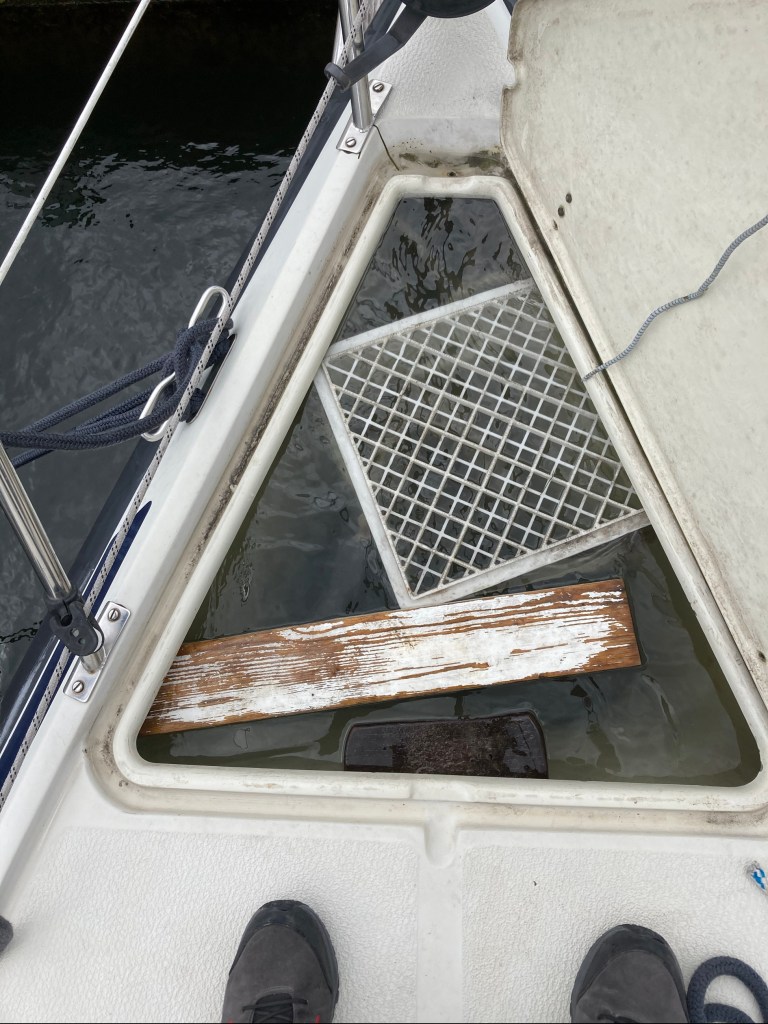 Rätt som det var såg vi att ankarboxens lucka började glipa och släppa ut vatten. För icke-seglare en liten förklaring; Ankarboxen är en inbyggd ”låda” längst fram på båtar. Där förvaras oftast ett ankare med lina, men där kan också fendrar och linor förvaras. Har man gasolspis är det en vanlig plats för tuben. Lådan har ett vattentätt skott mot resten av båten och har ett dränerings-avlopp i botten. Däcket dräneras alltså ner genom boxen, i normala fall…