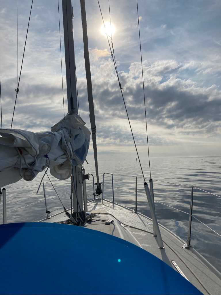 Det blev flera timmar utan vind i dag. Inte förrän vi var nästan framme vid Simrishamn kom vinden och ökade till 8 m/s samtidigt som vågorna dök upp från tomma intet.