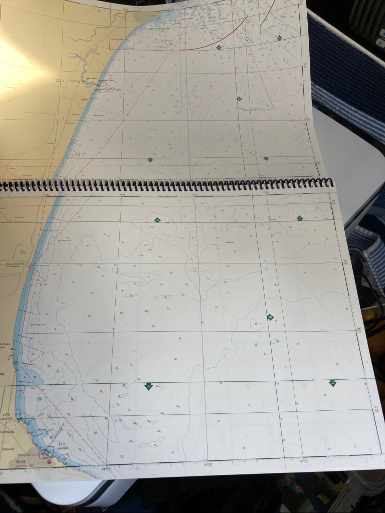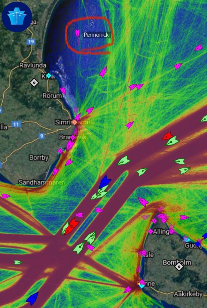 Vi är nu inte så långt från Bornholm. I Bornholmssundet går handelsfartygen i trafikseparerade farleder, som framgår av ”frekvensbilden”. På bilden ser man vår position, inringat, mitt mellan Åhus och Simrishamn.