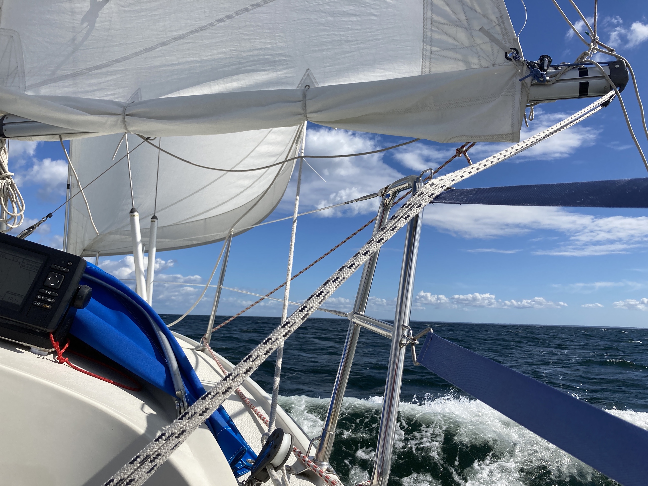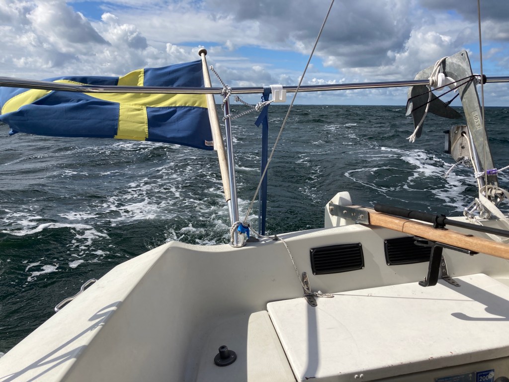 Väl ute i sundet blåser det stadigt 8 m/s och 11 i byarna. Starkaste vindbyn hittills ligger på 14,0 m/s. Då är det bra att köra revat. Vi har vinden snett in bakifrån, en djup slör alltså.