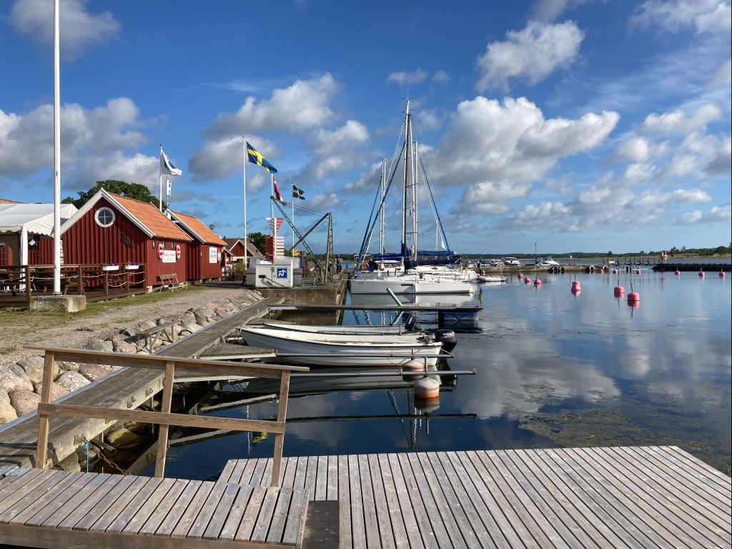 Kl 08:30 lämnade vi den fina gästhamnen i Kristianopel. Som syns på bilden, som togs strax innan vi lämnade hamnen, var det inte mycket vind där. Så det kändes lite fegt att sätta ett rev i storen. Men utanför hamnen blåste det. Upp till 11 i byarna rapporterade Janne (ellerLånge Jan som det officiella namnet är på fyren på Ölands södra udde).