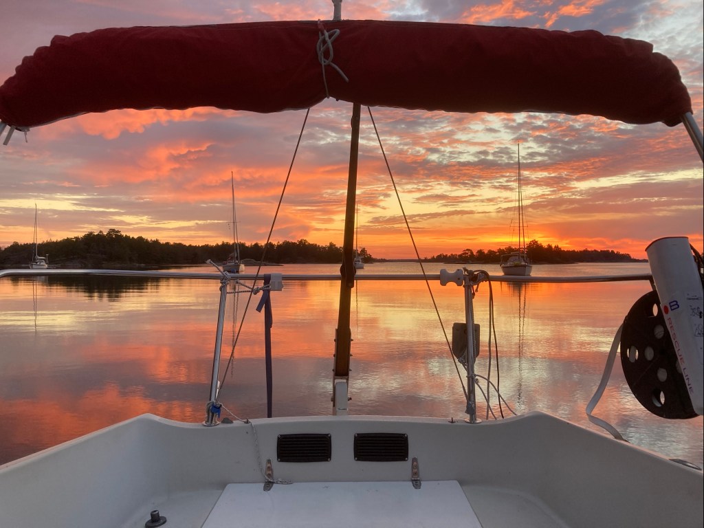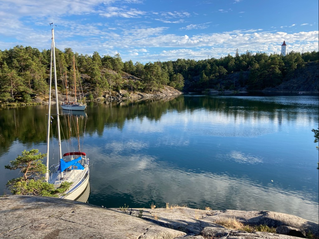 Nu har vi parkerat 4 sjömil från denna etapps slutmål, Västervik. Viken heter Spårögloet och är en rund flad, skyddad för alla vindar. Det är en spännande inpassage mellan ett grund och en liten berghäll.