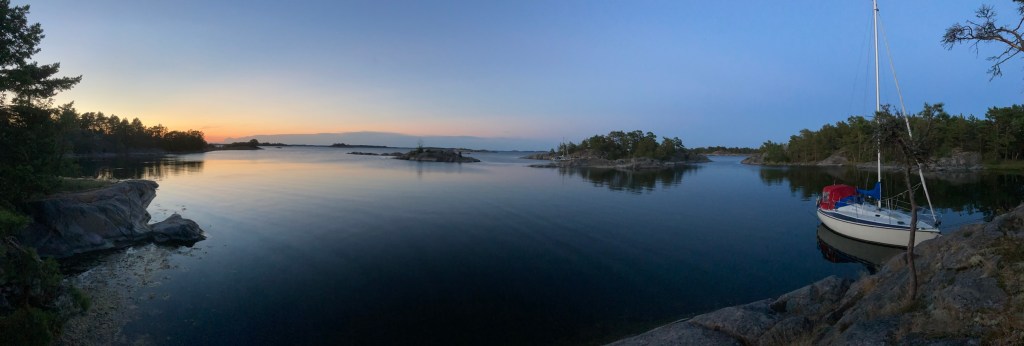 Laxvarp är en av båtfolk välkänd natthamn. Men för mig var det ändå första gången jag landsteg och förtöjde i en tall. Det är branta, höga, öar med mängder av möjliga förtöjningsplatser. Det nya sjökortet i plottern gör det löjligt enkelt att hitta bland öarna och att hitta exakt vilken plätt man kan lägga till vid.