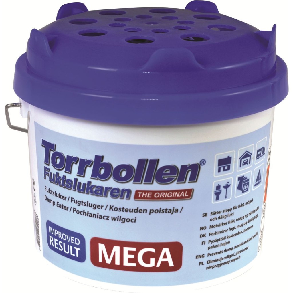 För att förhindra mögel får man välja mellan att öppna luckor fram o bak så mycket som möjligt, eller att stänga till alla ventilationsplatser och ställa in avfuktare (torrbollar). De senaste åren har det varit mycket fuktigt under vintern, så i min båt har det inte fungerat att ha ”öppet hus”. Därför är årets taktik att stänga till så mycket som möjligt. Jag har fått tag i tre ”torrbollar” av lite större format. Två är nu placerade i ruffen och en i motorrummet.