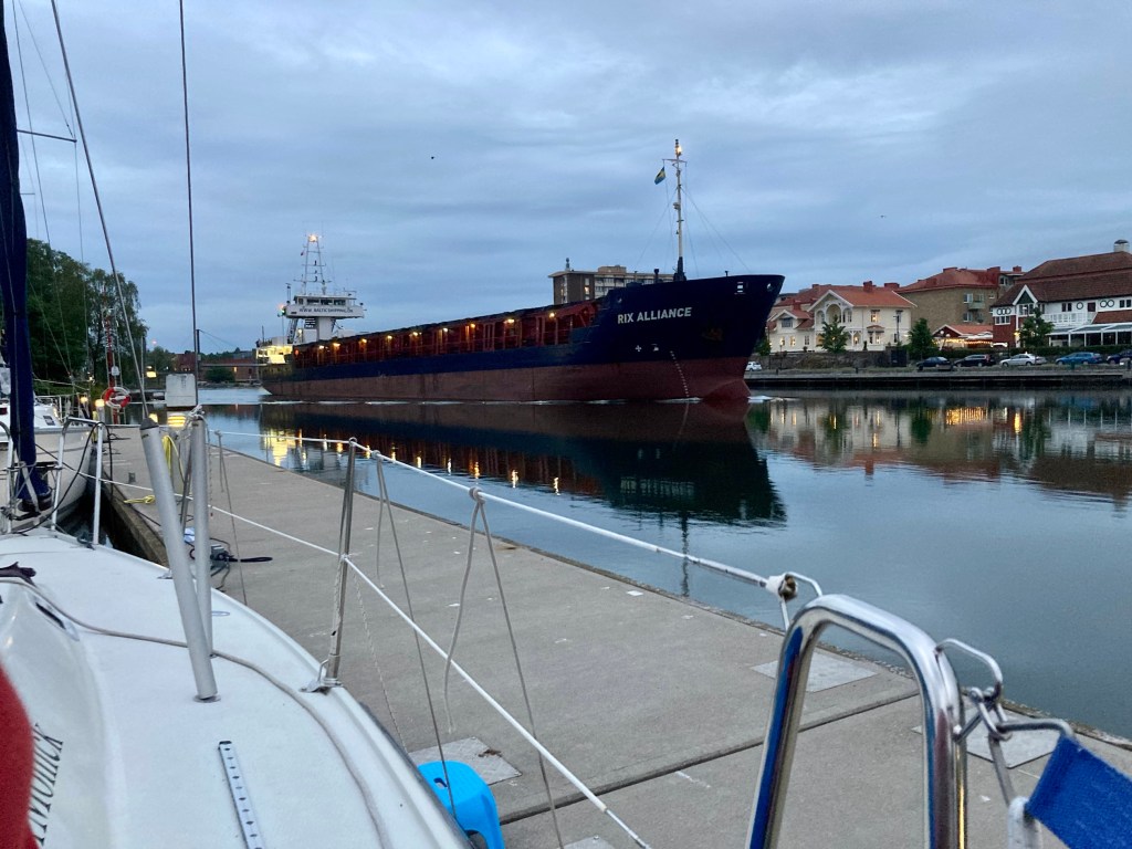Mitt i natten vaknade vi av ett högt propellerljud. Det var lastbåten Aland som passerade några meter från vår brygga.