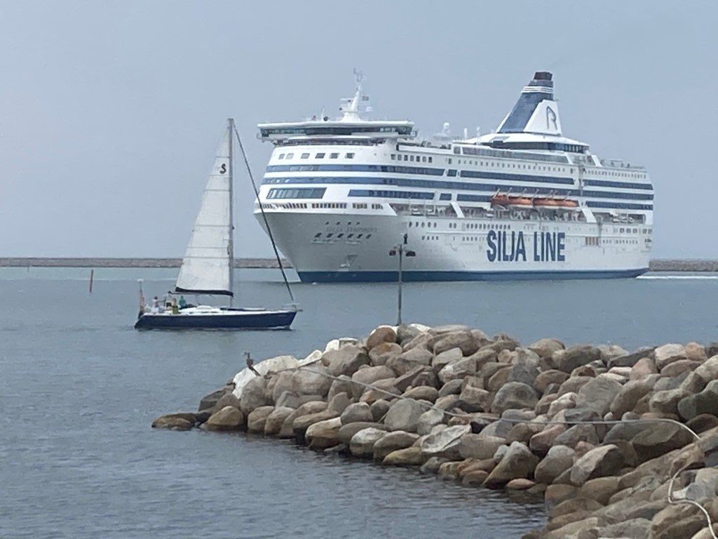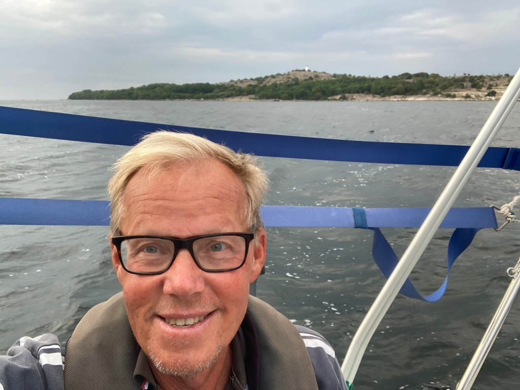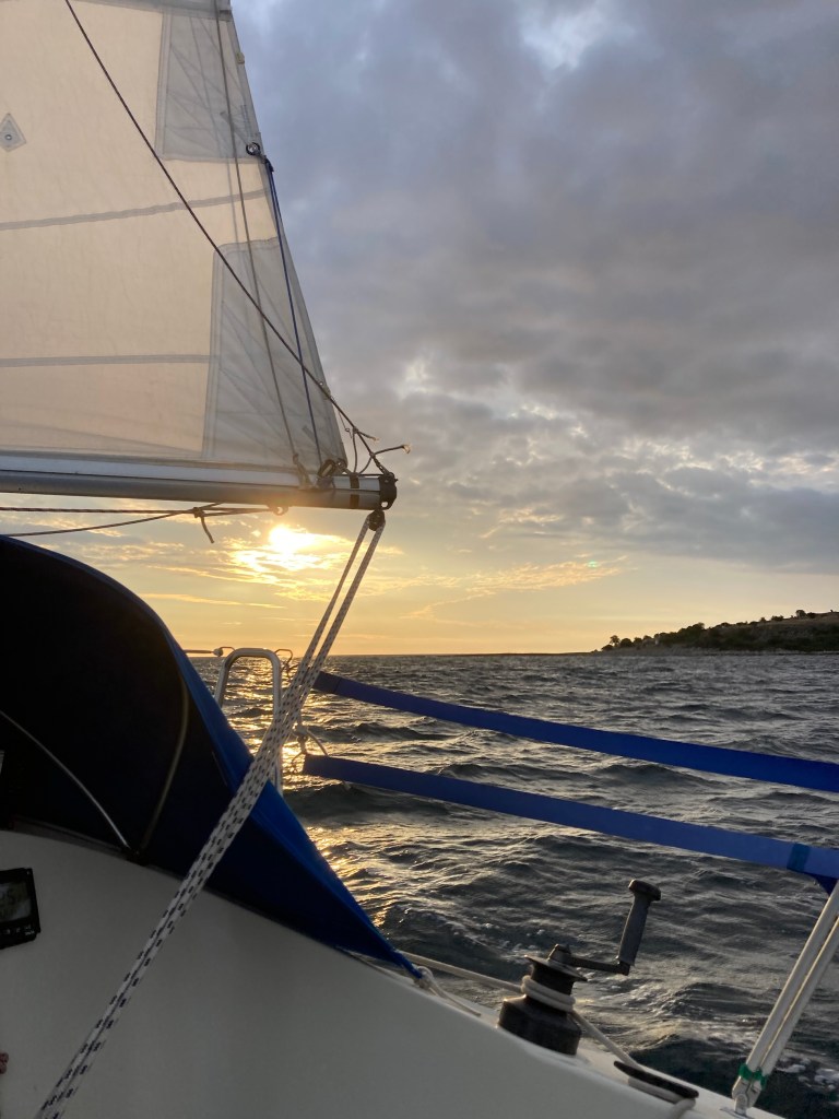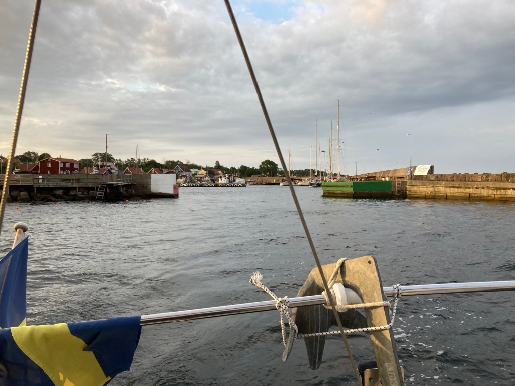 Prick klockan 06:00 seglade jag ut ut hamnen på Hanö med genuan utrullad. Det gick en del dyning fortfarande och det blåste 5-7 m/s. Lät autopiloten styra upp båten på dikt bidevind och skotade genuan hårt. Båten blev mycket lugnare och det var lätt att gå upp på däck och hissa storen. (Ja, jag vet att jag borde fixa så fallet går till sittbrunnen – får bli nästa års projekt…).