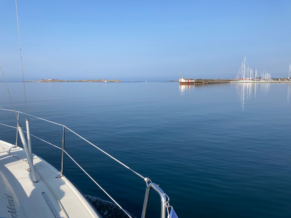 När vi bedömde att det var 1,5 timmar kvar till Falkenberg bestämde vi oss för att det var dax för mat. Matlagningen startade och strax ökade vinden. Och ökade.. . Restiden halverades! Vi rullade in genuan i ett försök att sänka farten, så vi skulle hinna äta innan vi var framme. Vi tog ner storen och länsade för bara riggen. Båten drev trots detta med drygt två knop mot Falkenberg.