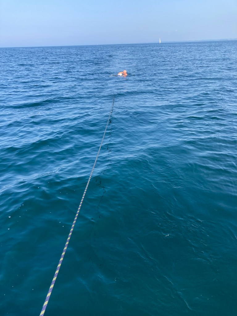 Efter ett tag för segel vi det var dax att bada. En stor fender fästes i änden på 20- meterslinan. Den släpade vi efter båten så den badande skulle ha en livlina…