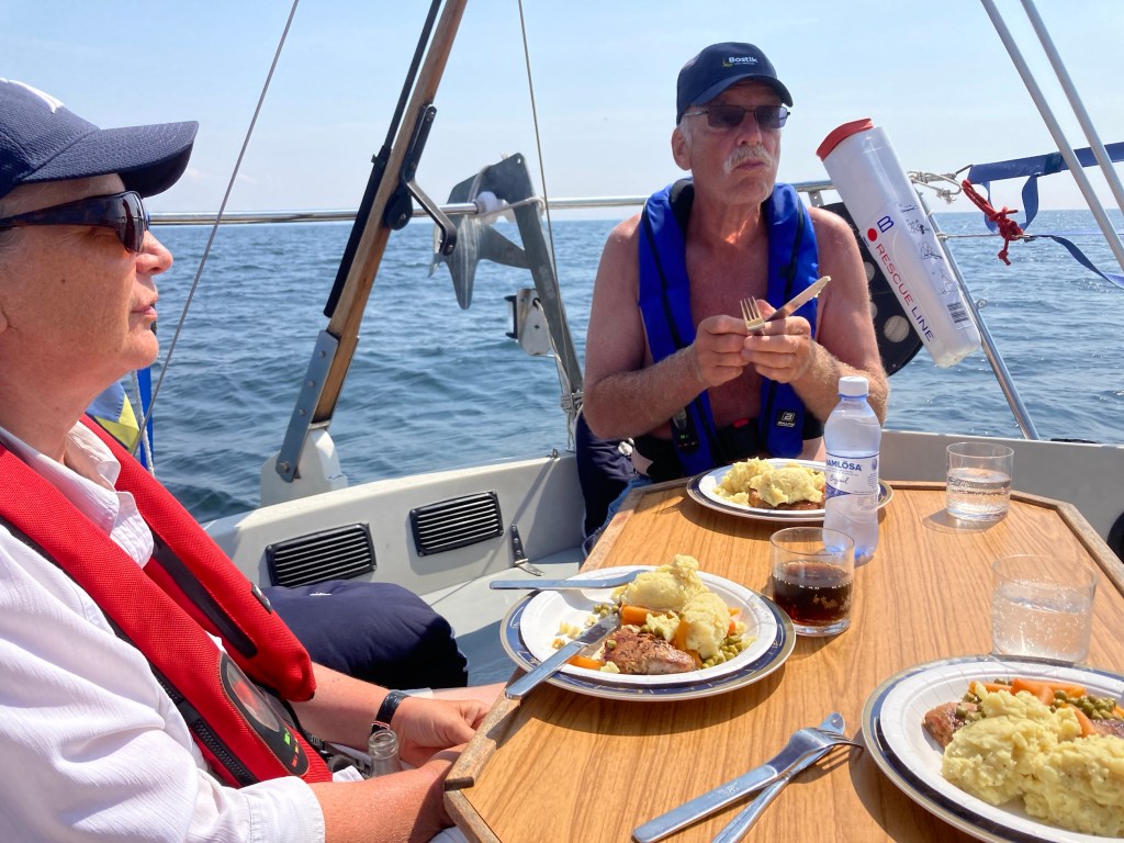 Till slut droppade vi ankaret på 8 meters djup (fin sand på botten). Sen kunde vi käka – trots att det guppade en del i vågorna.