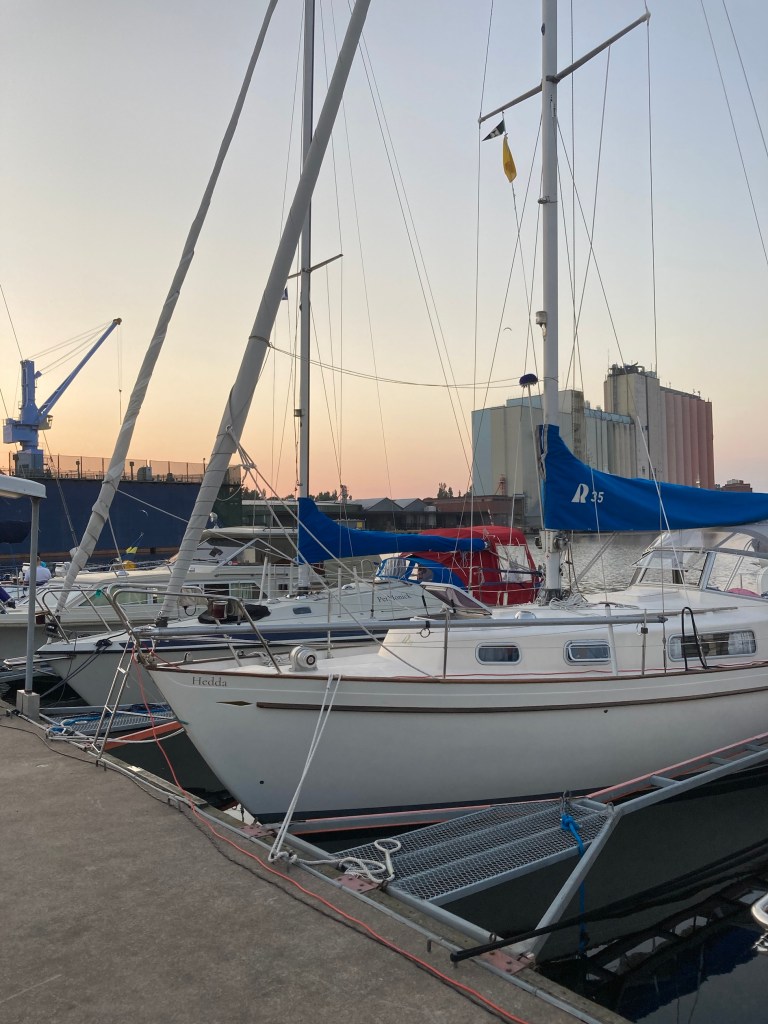 Vi hittade en grönmarkerad plats i gästhamnen med bommar. Perfekt placerad där vinden svalkade oss.