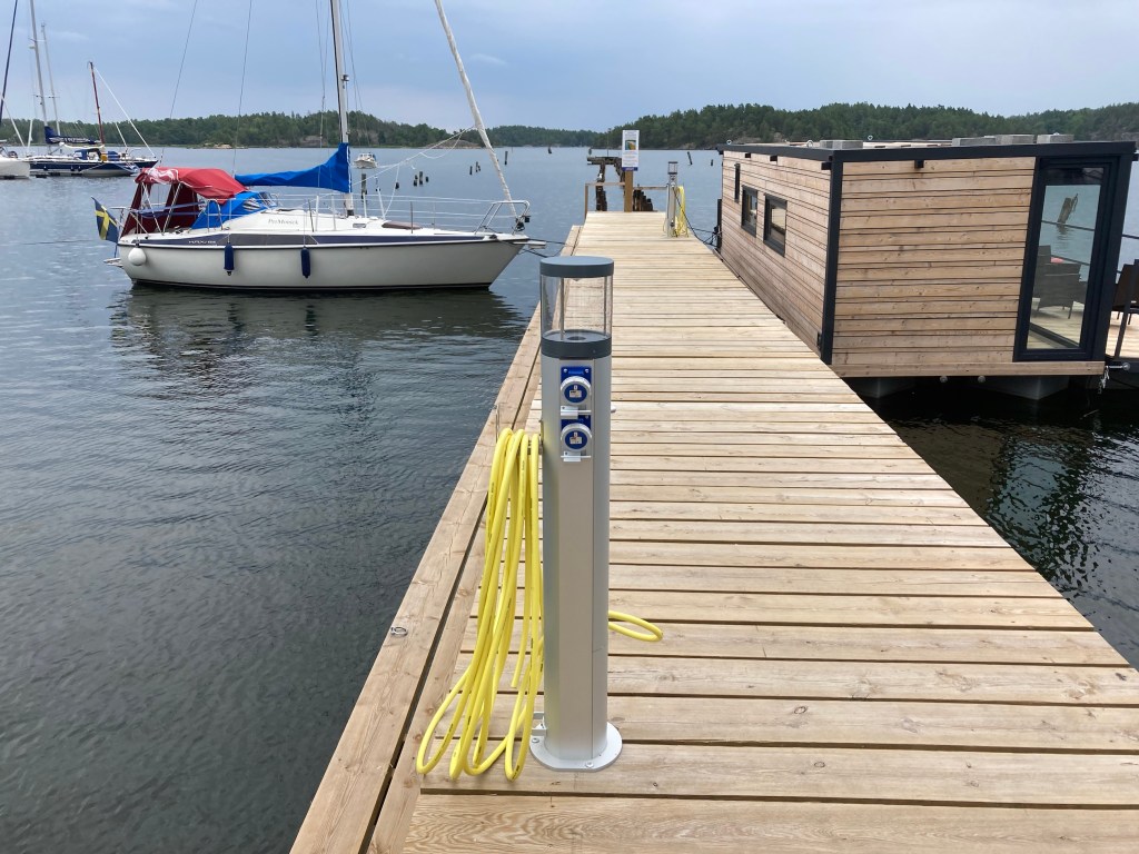 Den nya renoverade bryggan var försedd med nya elluttag och vattenposter. Det är en hög brygga, fast man har byggt en avstigningsnivå utmed hela bryggan. Mycket snyggt och praktiskt.