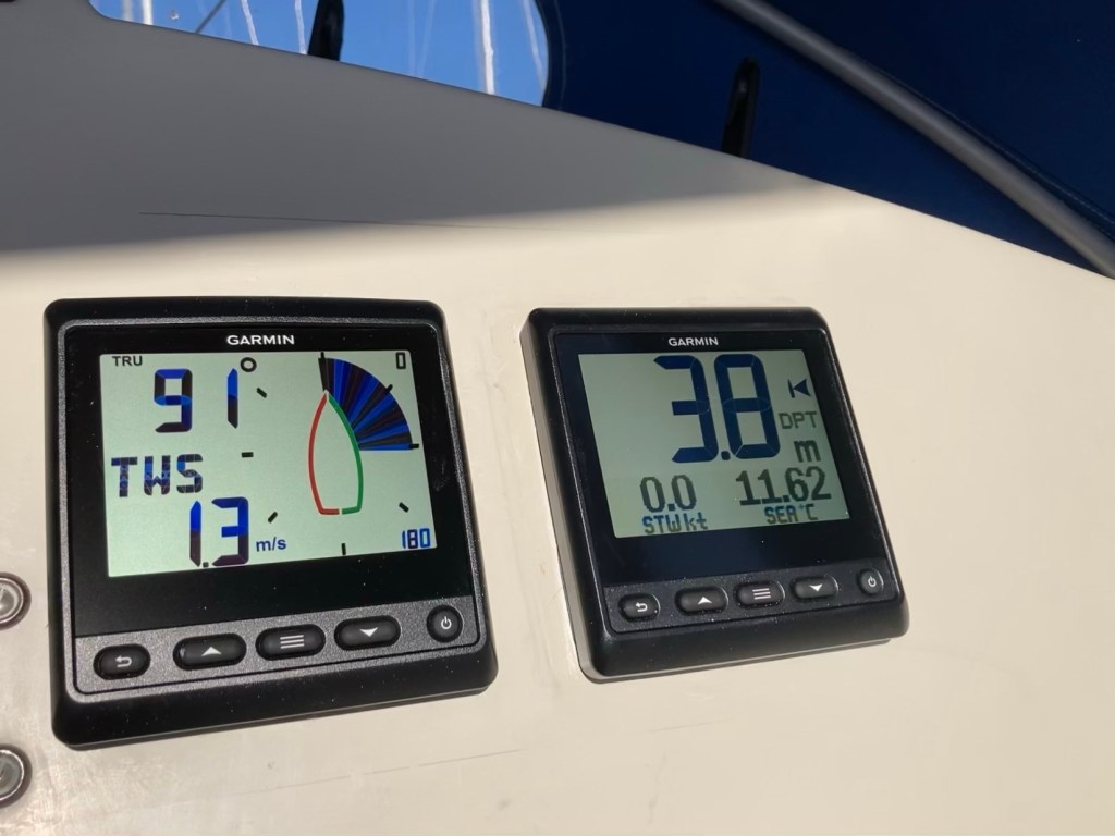 En sak som inte framgår av Garmins specifikationer är att lodet inte kan konfigureras (kölkompenseras är deras benämning) från lod-instrumentets dialogsystem. Man behöver ju lägga in en korrigering för hur djupt lodet monteras. Som tur var gick det att koppla in plottern (Garmin Echomap 72 SV) och göra justeringen därifrån.
