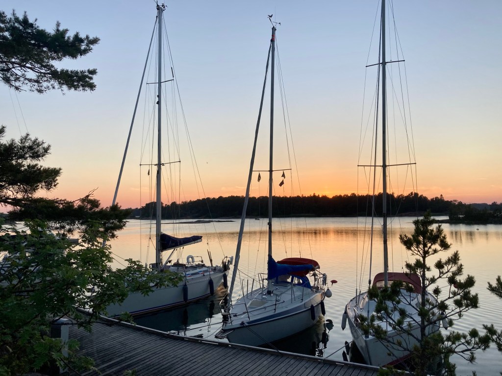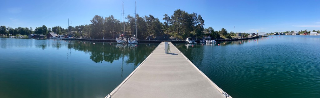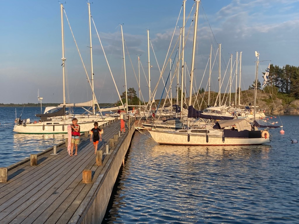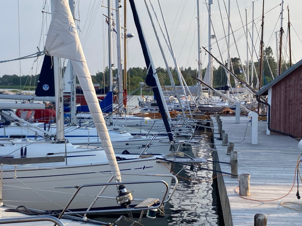 Gästhamnen i Lappo ligger innanför ett färjeläge, innanför några holmar. Vindar mellan N och O kan göra att det blir skvalpigt i hamnen. Från kl 1 i natt vrider vinden mot S och mellan kl 2 och 5 ska det bli regn. Kanske med lite åska. 5 m/s och kanske det dubbla i byarna. Så linor med gummidämpare är monterade inför natten.