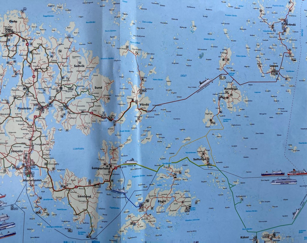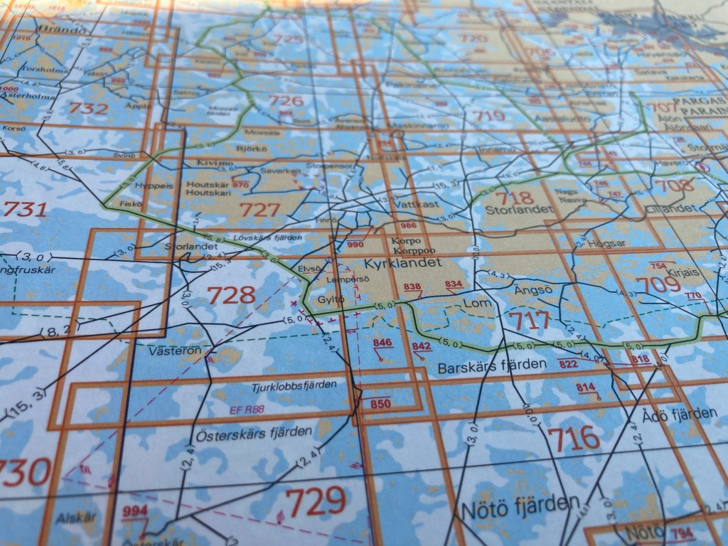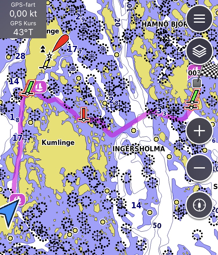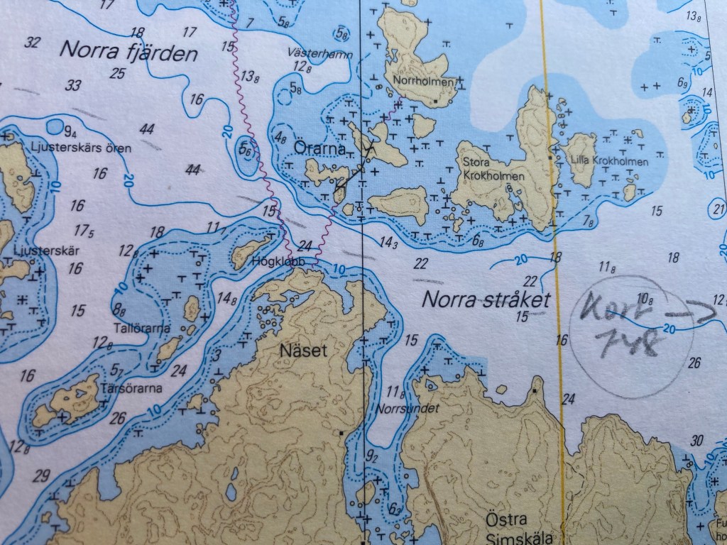 Leden smalnade av och vek av mot SO, därifrån det blåste. Det blev ganska trixigt mellan prickar och väderstrecksmärken (= kardinalmärken). Så det blev motorn som fick hjälpa till.