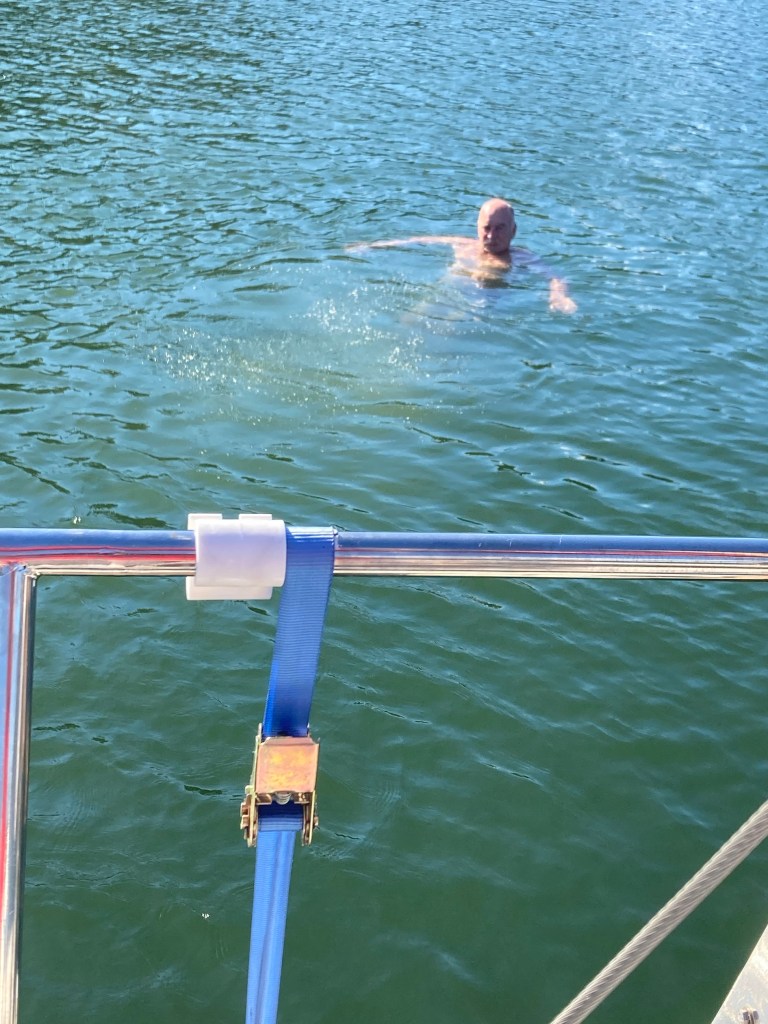 Så snart vi ankrat kastade sig Malte i vattnet. Per kom efter med viss tvekan, på ett betydligt försiktigare sätt. Men väl i vattnet var det skönt med svalkan efter dagens häftiga solsken.