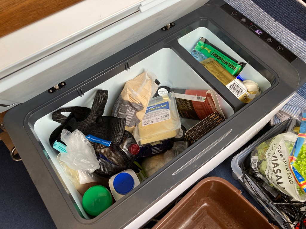 Den nya kylen, däremot, är konstant ställd på +6 grader. Håller man den bara välfylld så är det inga problem att hålla den kyld. Den kylen har ett eget 12-voltsbatteri på 70 amp. Det laddas bara när vi har landström. Drygt 2 dygn räcker batteriet när det är varma sommardagar. Det går att koppla över kylen på förbrukarbanken (3 x 70 amp), som laddas via solpanel, motor och landström.