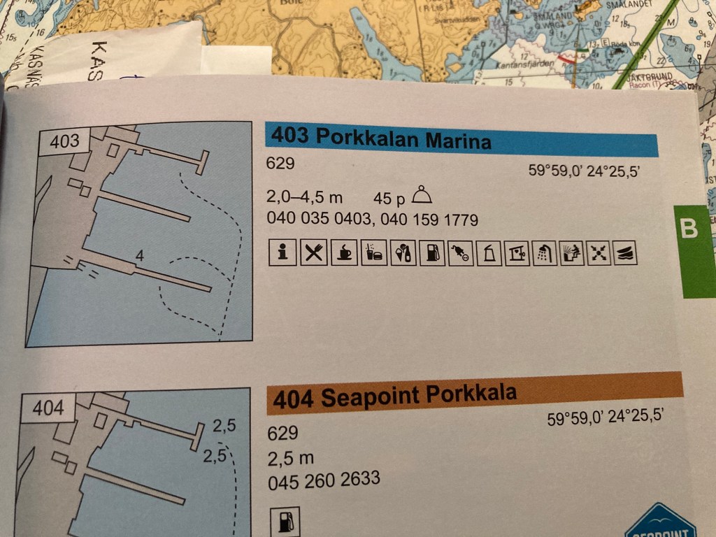 I sjökortet finns små röda rutor med ett tresiffrigt nummer. Det betyder att det finns något slags hamn för fritidsbåtar på platsen. I boken Besökshamnar kan man leta upp den aktuella hamnen och läsa en ytterst koncentrerad beskrivning. Typ vilken service som erbjuds, bryggornas placering, djupet vid bryggorna, typ av förtöjning (boj, pålar, spilta (bommar), långsida eller ankare).