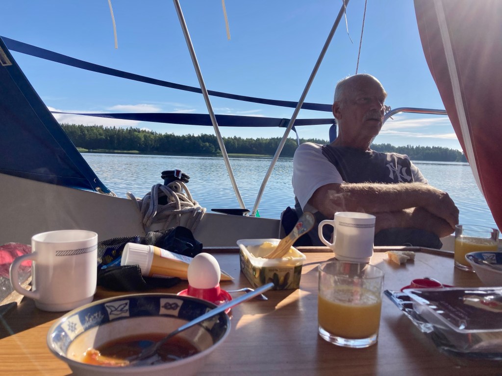Vi passerade Rödjan, som vi hade som natthamn när vi seglade mot Helsingfors. Nu är det fullt i hamnen. Efter lite efterforskningar kunde vi läsa att bastun brann ner 2018 och toaletten 2019. Båda mitt på sommaren. Det förklarar det bedrövliga torrdass de har nu…