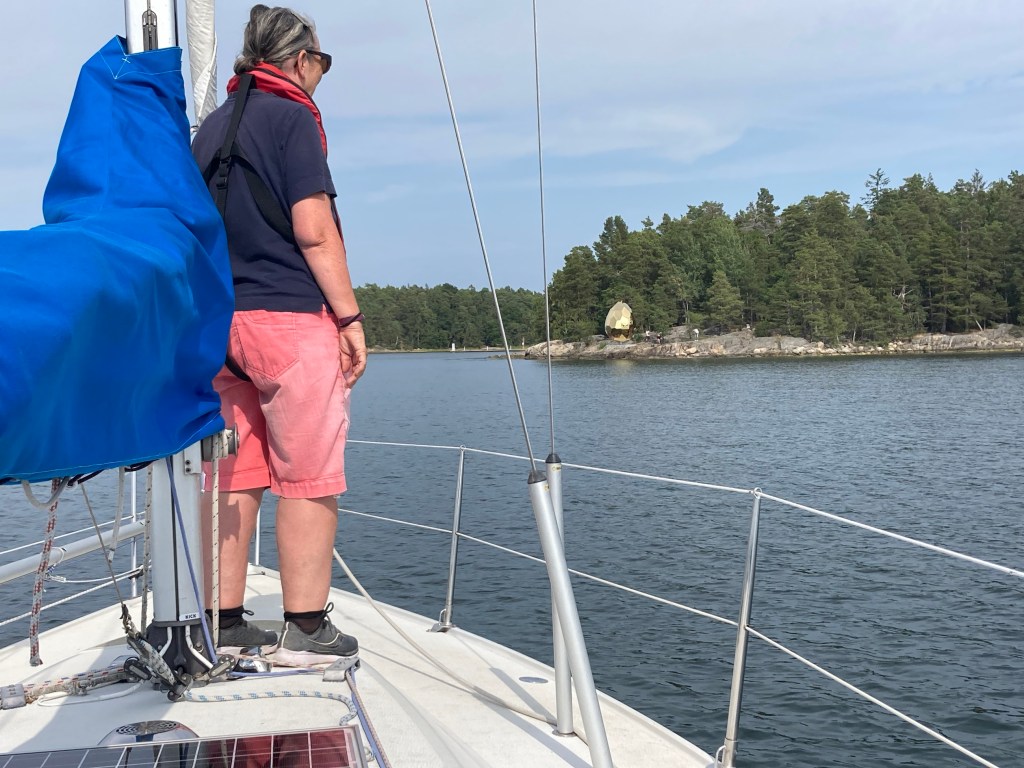 Min Monica, som fortfarande jobbar, fick pendla med färjorna från Helsingfors och till Mariehamn för att kunna jobba tre veckor mitt i seglingen. I år fick Monica ta det försiktigt pga en bruten handled. Men det fixade hon galant. Hon är fantastisk!