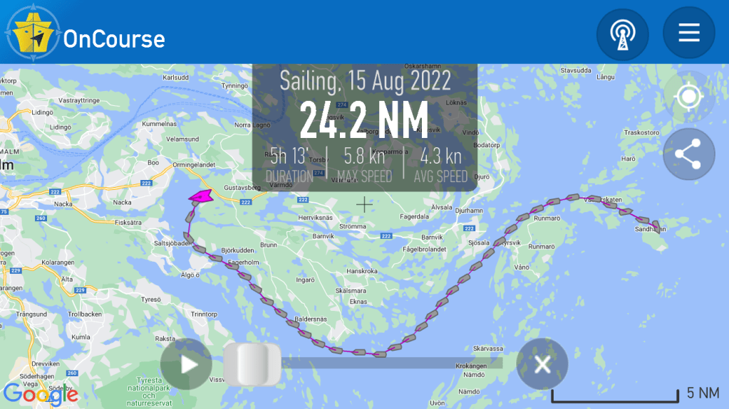Det blåste väl inte 16 som utanför Oxelösund men båten krängde rejält när vinden vred från O till SO och gav oss en riktig pust. Samtidigt började det blixtra och åska i närheten.