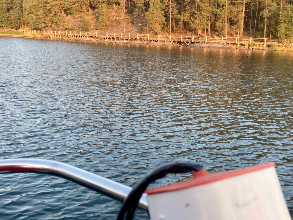 När vi passerade Lökholmarna vred vinden mot syd samtidigt som den avtog till 2-3 m/s. På Örsbaken mötte vi de största vågor (dyning) som vi sett under hela seglingen. Det måste blåsa ordentligt ute till havs, för här inne bland öarna var det svag vind.