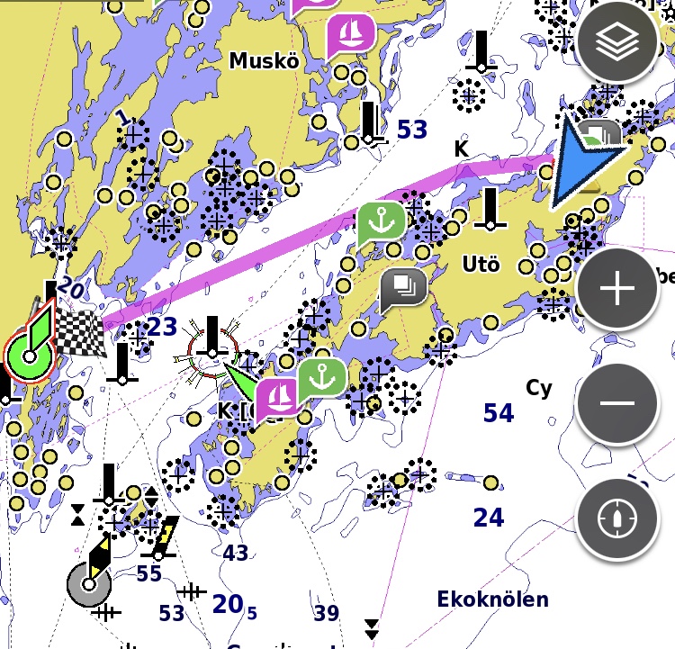 - Sjökorten är blåa från 10 meter och grundare. Finns oftast sex- och tremeterskurva inom det bå området.