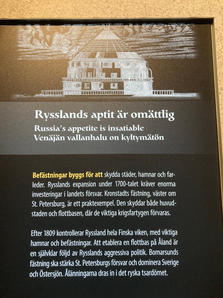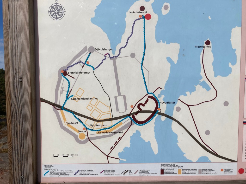 Det var en upplevelse att vandra runt hela befästningsområdet. Det fanns massor av lämningar från påbörjade byggnader och nedbrända stadsdelar. Vi var uppe på öns högsta punkt dit ryssarna på 1840-talet hade anlagt en stenbelagd väg och sprängt av toppen berget för att kunna börja bygga ännu ett försvarstorn. Men engelsmännen och de franska soldaterna kom emellan och allt sprängdes i bitar.