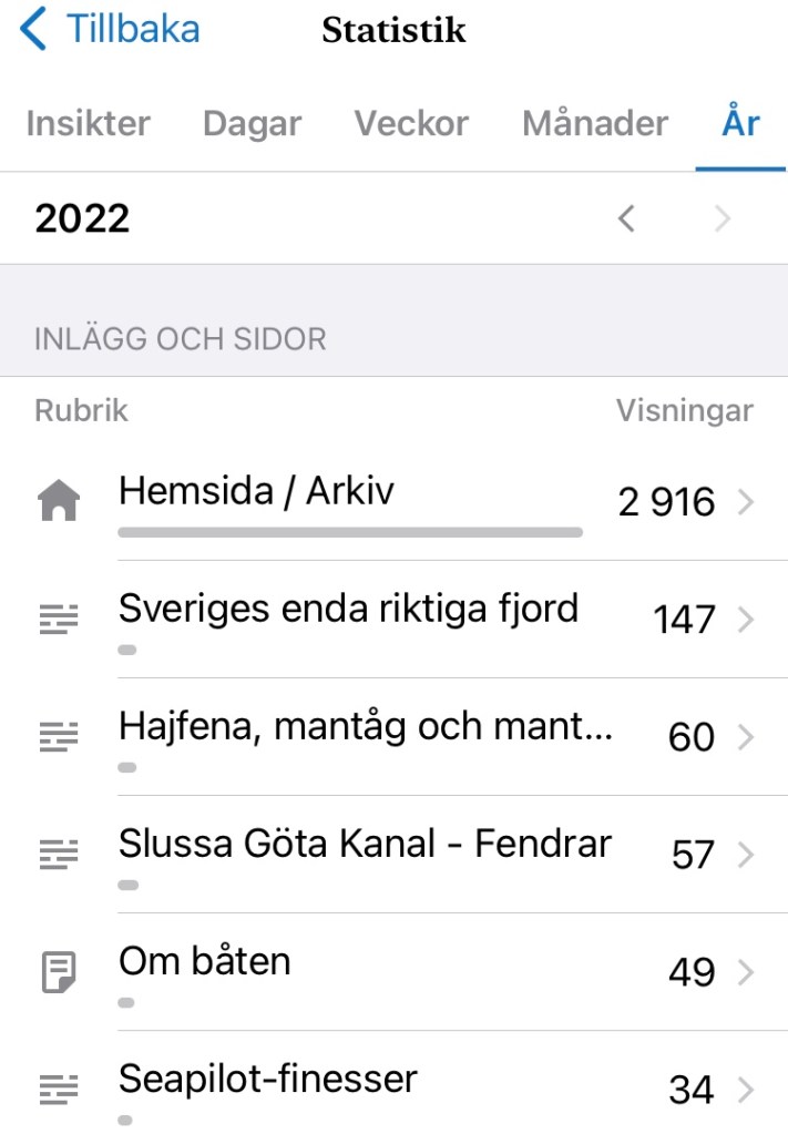 Kul är även att utläsa vilka inlägg som är mest populära. Först hamnar alltid hemsidan. I år är det sedan blogginlägget om ”Sveriges enda riktiga fjord” som varit mest intressant. Tvåan ”Hajfena, mantåg och mantågsband” var vinnare år 2021. Den tror jag är populär pga taggen ”Hajfena” – så många blir nog överraskade över vad det är för slags hajfena det här handlar om 😂.